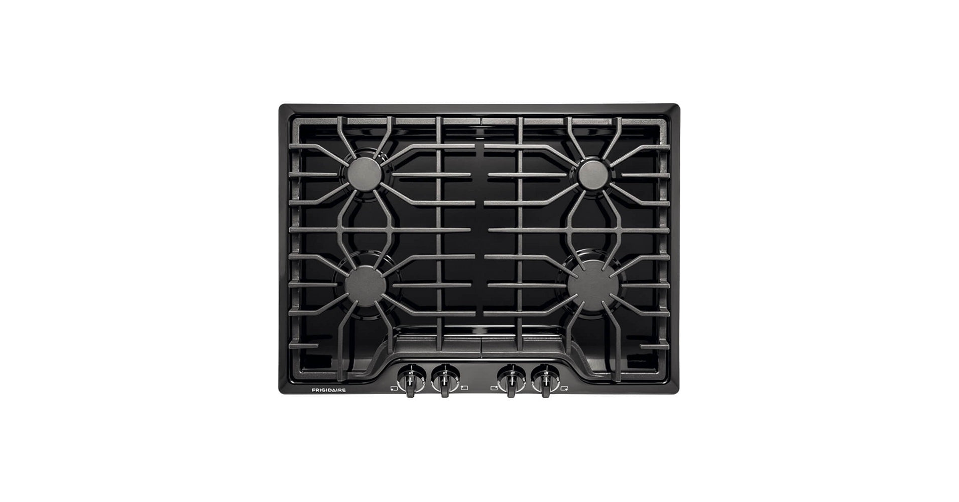 30" Gas Cooktop Simple and sleek, this 30-inch gas cooktop by Frigidaire features four (4) sealed burners, which makes for easy cleaning in the seamless drop-well surface. On this surface are strong cast iron grates with a black matte finish. Frigidaire's Ready-Select controls make selecting flame settings quick and easy. There's a range of BTU power, from 15,000 for high-octane cooking to 5,000 for low simmering of delicate foods and sauces. Available for you here at AJMadsion.com